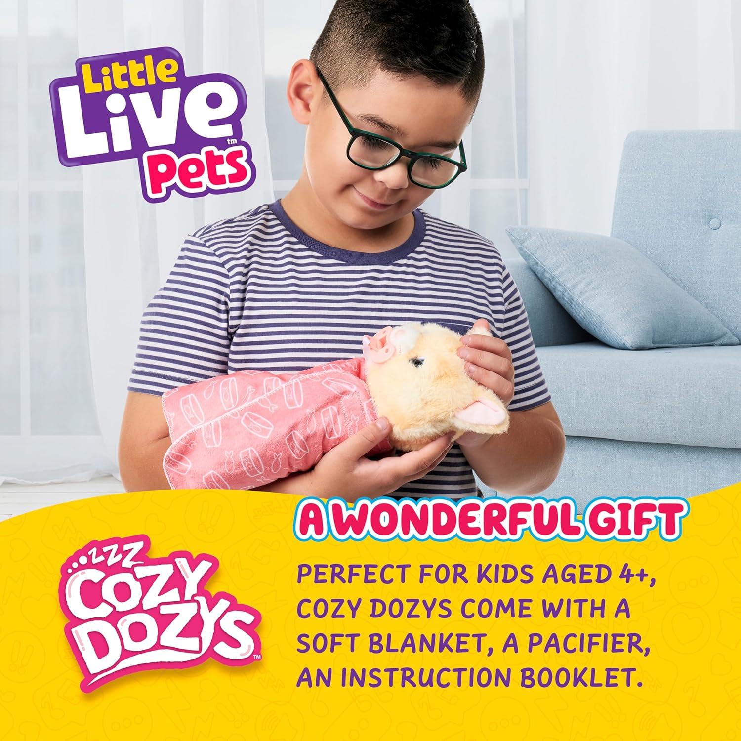 Little Live Pets Kitty Cozy Dozys Ginger Single Pack: Bring home Ginger, the cat toy for kids and turn bedtime into a gentle story of caring play. This lifelike plush electronic pet looks, feels, and behaves like a real kitten, encouraging nurturing pretend adventures for children aged 4 and up while helping them drift off to sleep. Packed with 25+ charming sounds and reactions, this live cat giggles when her tummy is tickled, laughs when her head is patted, and always invites one more cuddle. The magical eyes of these interactive plush toys slowly open and close during quiet moments, a soothing motion that adds believable personality and comforts little ones as they wind down. Soft orange and white fur makes this battery operated cat irresistibly huggable, and when tucked into the included blanket and placed with the pacifier in her mouth, our lifelike kitten snores gently and slips into dreamland beside them. Preinstalled batteries mean our interactive animal toys are ready to delight straight from the box, with no setup or charging needed, making her ideal for endless imaginative play.